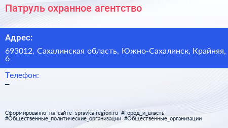 Патруль, охранное агентство по адресу 693012, Сахалинская область, Южно-Сахалинск, Крайняя, 6 в дальнейшем Организация, размещена в следующих категориях: