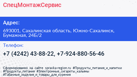 СпецМонтажСервис по адресу 693001, Сахалинская область, Южно-Сахалинск, Бумажная, 24Б/2 в дальнейшем Организация, размещена в следующих категориях: