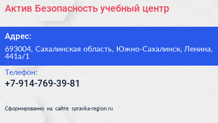Актив-Безопасность, учебный центр по адресу 693004, Сахалинская область, Южно-Сахалинск, Ленина, 441а/1 в дальнейшем Организация, размещена в следующих категориях: