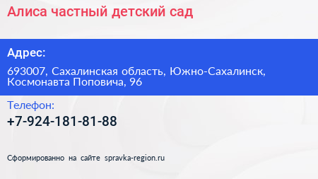 Алиса, частный детский сад по адресу 693007, Сахалинская область, Южно-Сахалинск, Космонавта Поповича, 96 в дальнейшем Организация, размещена в следующих категориях: