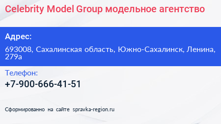 Celebrity Model Group, модельное агентство по адресу 693008, Сахалинская область, Южно-Сахалинск, Ленина, 279а в дальнейшем Организация, размещена в следующих категориях: