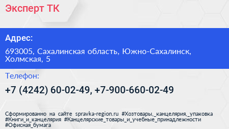 Эксперт ТК по адресу 693005, Сахалинская область, Южно-Сахалинск, Холмская, 5 в дальнейшем Организация, размещена в следующих категориях: