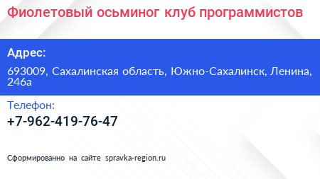 Фиолетовый осьминог, клуб программистов по адресу 693009, Сахалинская область, Южно-Сахалинск, Ленина, 246а в дальнейшем Организация, размещена в следующих категориях: