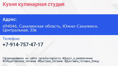 Кухня, кулинарная студия по адресу 694046, Сахалинская область, Южно-Сахалинск, Центральная, 33в в дальнейшем Организация, размещена в следующих категориях: