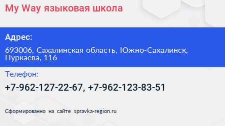 My Way, языковая школа по адресу 693006, Сахалинская область, Южно-Сахалинск, Пуркаева, 116 в дальнейшем Организация, размещена в следующих категориях: