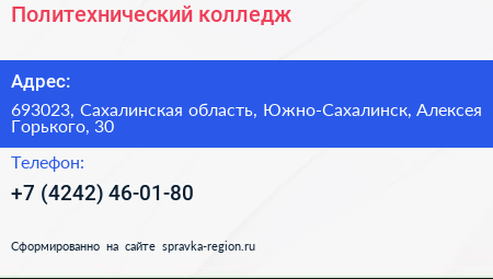 Политехнический колледж по адресу 693023, Сахалинская область, Южно-Сахалинск, Алексея Горького, 30 в дальнейшем Организация, размещена в следующих категориях: