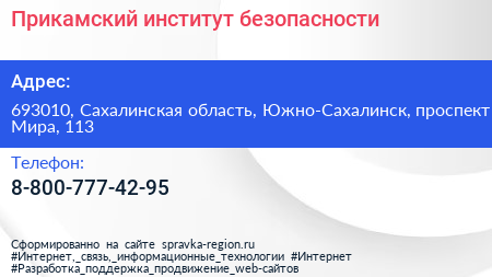 Прикамский институт безопасности по адресу 693010, Сахалинская область, Южно-Сахалинск, проспект Мира, 113 в дальнейшем Организация, размещена в следующих категориях: