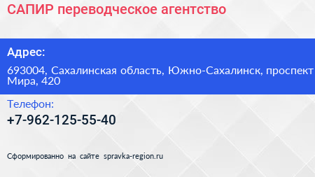САПИР, переводческое агентство по адресу 693004, Сахалинская область, Южно-Сахалинск, проспект Мира, 420 в дальнейшем Организация, размещена в следующих категориях: