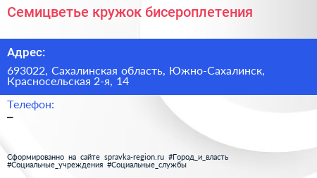 Семицветье, кружок бисероплетения по адресу 693022, Сахалинская область, Южно-Сахалинск, Красносельская 2-я, 14 в дальнейшем Организация, размещена в следующих категориях: