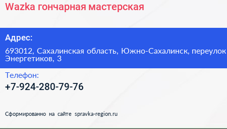 Wazka, гончарная мастерская по адресу 693012, Сахалинская область, Южно-Сахалинск, переулок Энергетиков, 3 в дальнейшем Организация, размещена в следующих категориях: