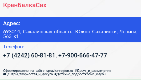 КранБалкаСах по адресу 693014, Сахалинская область, Южно-Сахалинск, Ленина, 563 к1 в дальнейшем Организация, размещена в следующих категориях: