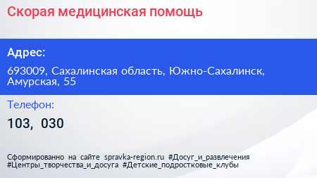 Скорая медицинская помощь по адресу 693009, Сахалинская область, Южно-Сахалинск, Амурская, 55 в дальнейшем Организация, размещена в следующих категориях: