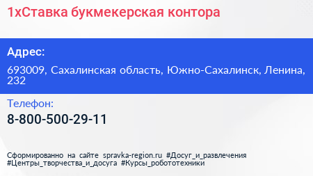 1xСтавка, букмекерская контора по адресу 693009, Сахалинская область, Южно-Сахалинск, Ленина, 232 в дальнейшем Организация, размещена в следующих категориях: