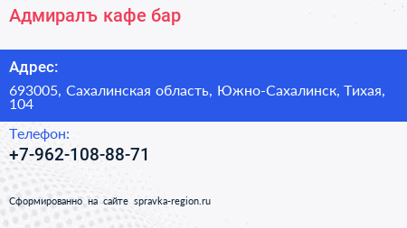 Адмиралъ, кафе-бар по адресу 693005, Сахалинская область, Южно-Сахалинск, Тихая, 104 в дальнейшем Организация, размещена в следующих категориях: