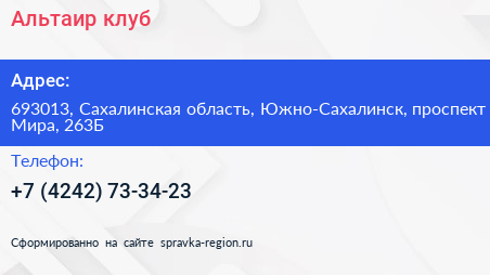 Альтаир, клуб по адресу 693013, Сахалинская область, Южно-Сахалинск, проспект Мира, 263Б в дальнейшем Организация, размещена в следующих категориях: