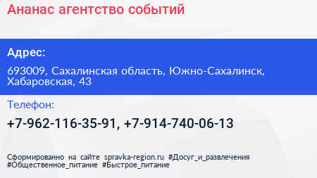 Ананас, агентство событий по адресу 693009, Сахалинская область, Южно-Сахалинск, Хабаровская, 43 в дальнейшем Организация, размещена в следующих категориях: