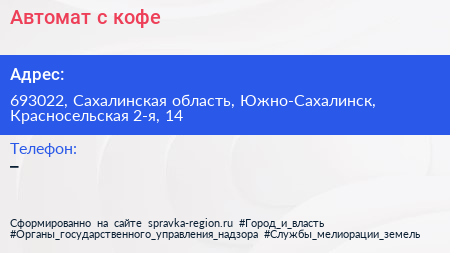 Автомат с кофе по адресу 693022, Сахалинская область, Южно-Сахалинск, Красносельская 2-я, 14 в дальнейшем Организация, размещена в следующих категориях: