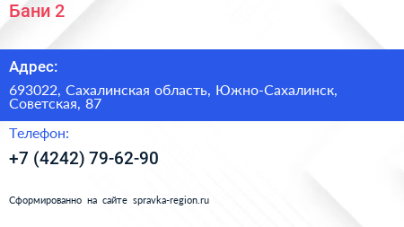 Бани-2 по адресу 693022, Сахалинская область, Южно-Сахалинск, Советская, 87 в дальнейшем Организация, размещена в следующих категориях: