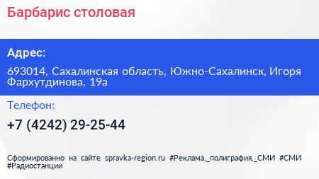 Барбарис, столовая по адресу 693014, Сахалинская область, Южно-Сахалинск, Игоря Фархутдинова, 19а в дальнейшем Организация, размещена в следующих категориях: