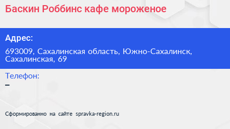 Баскин Роббинс, кафе-мороженое по адресу 693009, Сахалинская область, Южно-Сахалинск, Сахалинская, 69 в дальнейшем Организация, размещена в следующих категориях: