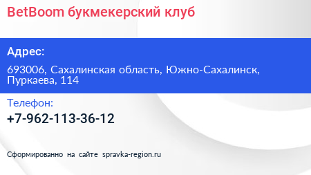 BetBoom, букмекерский клуб по адресу 693006, Сахалинская область, Южно-Сахалинск, Пуркаева, 114 в дальнейшем Организация, размещена в следующих категориях: