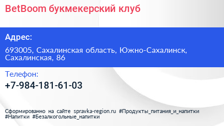 BetBoom, букмекерский клуб по адресу 693005, Сахалинская область, Южно-Сахалинск, Сахалинская, 86 в дальнейшем Организация, размещена в следующих категориях: