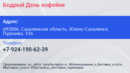 Бодрый День, кофейня по адресу 693006, Сахалинская область, Южно-Сахалинск, Пуркаева, 116 в дальнейшем Организация, размещена в следующих категориях: