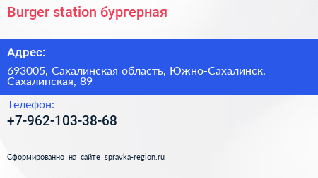 Burger station, бургерная по адресу 693005, Сахалинская область, Южно-Сахалинск, Сахалинская, 89 в дальнейшем Организация, размещена в следующих категориях: