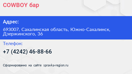 COWBOY, бар по адресу 693007, Сахалинская область, Южно-Сахалинск, Дзержинского, 36 в дальнейшем Организация, размещена в следующих категориях: