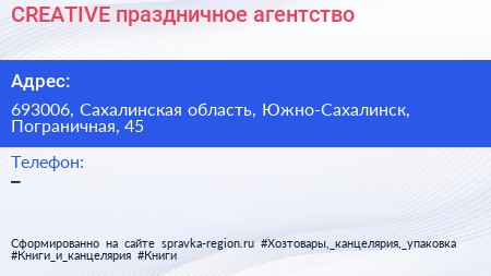 CREATIVE, праздничное агентство по адресу 693006, Сахалинская область, Южно-Сахалинск, Пограничная, 45 в дальнейшем Организация, размещена в следующих категориях: