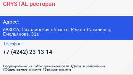 CRYSTAL, ресторан по адресу 693006, Сахалинская область, Южно-Сахалинск, Емельянова, 31а в дальнейшем Организация, размещена в следующих категориях:
