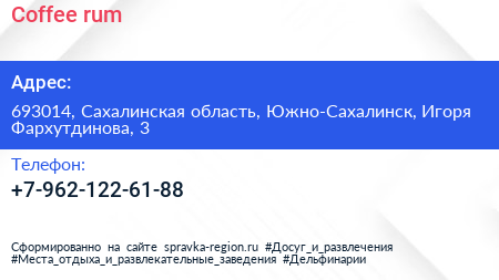 Coffee rum по адресу 693014, Сахалинская область, Южно-Сахалинск, Игоря Фархутдинова, 3 в дальнейшем Организация, размещена в следующих категориях: