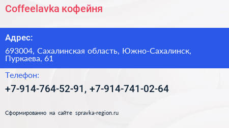 Coffeelavka, кофейня по адресу 693004, Сахалинская область, Южно-Сахалинск, Пуркаева, 61 в дальнейшем Организация, размещена в следующих категориях: