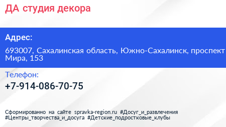 ДА, студия декора по адресу 693007, Сахалинская область, Южно-Сахалинск, проспект Мира, 153 в дальнейшем Организация, размещена в следующих категориях: