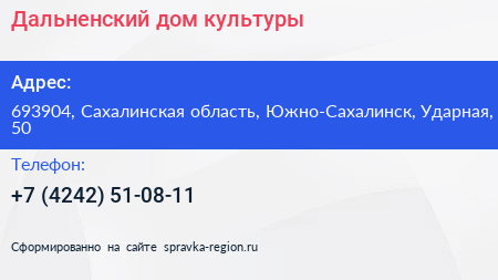 Дальненский дом культуры по адресу 693904, Сахалинская область, Южно-Сахалинск, Ударная, 50 в дальнейшем Организация, размещена в следующих категориях: