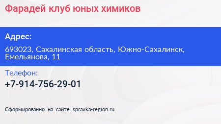 Фарадей, клуб юных химиков по адресу 693023, Сахалинская область, Южно-Сахалинск, Емельянова, 11 в дальнейшем Организация, размещена в следующих категориях: