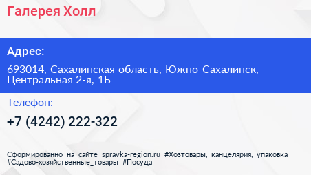 Галерея Холл по адресу 693014, Сахалинская область, Южно-Сахалинск, Центральная 2-я, 1Б в дальнейшем Организация, размещена в следующих категориях: