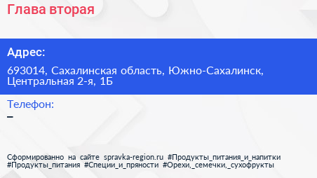 Глава вторая по адресу 693014, Сахалинская область, Южно-Сахалинск, Центральная 2-я, 1Б в дальнейшем Организация, размещена в следующих категориях: