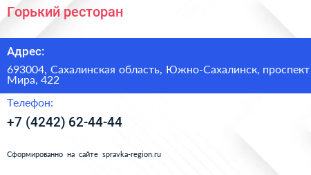 Горький, ресторан по адресу 693004, Сахалинская область, Южно-Сахалинск, проспект Мира, 422 в дальнейшем Организация, размещена в следующих категориях: