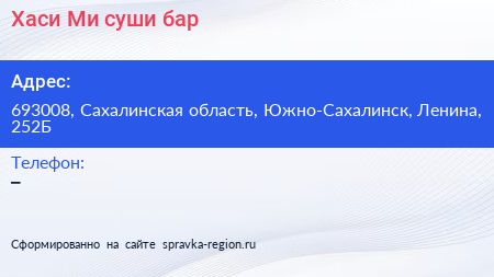 Хаси-Ми, суши-бар по адресу 693008, Сахалинская область, Южно-Сахалинск, Ленина, 252Б в дальнейшем Организация, размещена в следующих категориях: