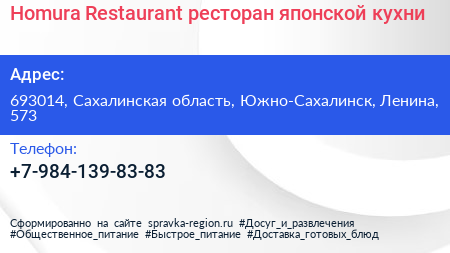 Homura Restaurant, ресторан японской кухни по адресу 693014, Сахалинская область, Южно-Сахалинск, Ленина, 573 в дальнейшем Организация, размещена в следующих категориях: