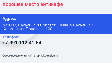 Хорошее место, антикафе по адресу 693007, Сахалинская область, Южно-Сахалинск, Космонавта Поповича, 100 в дальнейшем Организация, размещена в следующих категориях: