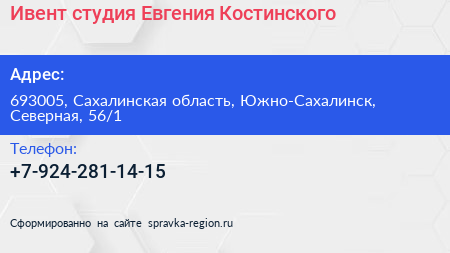 Ивент-студия Евгения Костинского по адресу 693005, Сахалинская область, Южно-Сахалинск, Северная, 56/1 в дальнейшем Организация, размещена в следующих категориях: