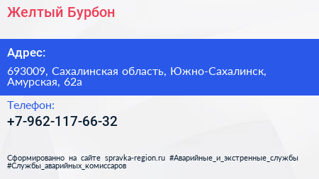 Желтый Бурбон по адресу 693009, Сахалинская область, Южно-Сахалинск, Амурская, 62а в дальнейшем Организация, размещена в следующих категориях: