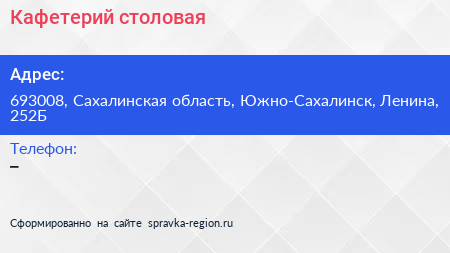Кафетерий-столовая по адресу 693008, Сахалинская область, Южно-Сахалинск, Ленина, 252Б в дальнейшем Организация, размещена в следующих категориях: