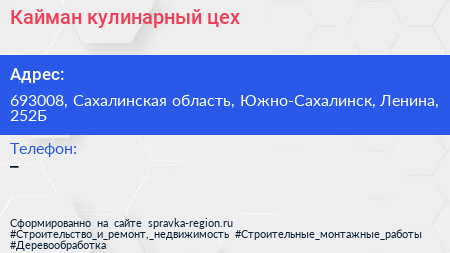 Кайман, кулинарный цех по адресу 693008, Сахалинская область, Южно-Сахалинск, Ленина, 252Б в дальнейшем Организация, размещена в следующих категориях:
