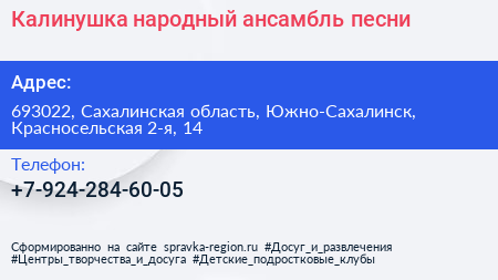 Калинушка, народный ансамбль песни по адресу 693022, Сахалинская область, Южно-Сахалинск, Красносельская 2-я, 14 в дальнейшем Организация, размещена в следующих категориях:
