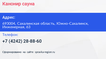 Канонир, сауна по адресу 693004, Сахалинская область, Южно-Сахалинск, Инженерная, 63 в дальнейшем Организация, размещена в следующих категориях:
