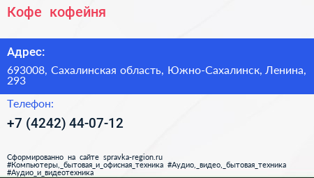 Кофе+, кофейня по адресу 693008, Сахалинская область, Южно-Сахалинск, Ленина, 293 в дальнейшем Организация, размещена в следующих категориях: