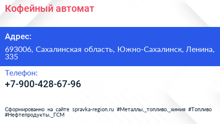 Кофейный автомат по адресу 693006, Сахалинская область, Южно-Сахалинск, Ленина, 335 в дальнейшем Организация, размещена в следующих категориях: